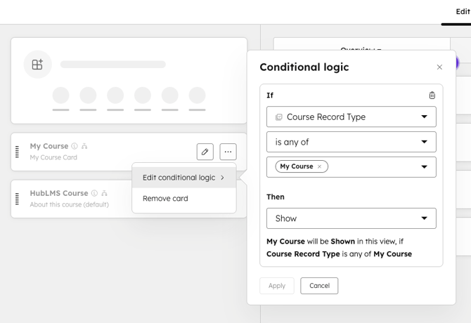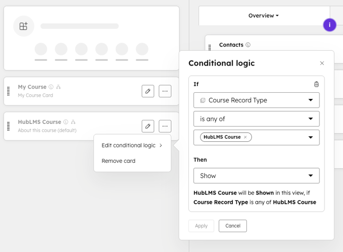 - Set conditional logic for the card to only show if Course Record Type is any of HubLMS Course.