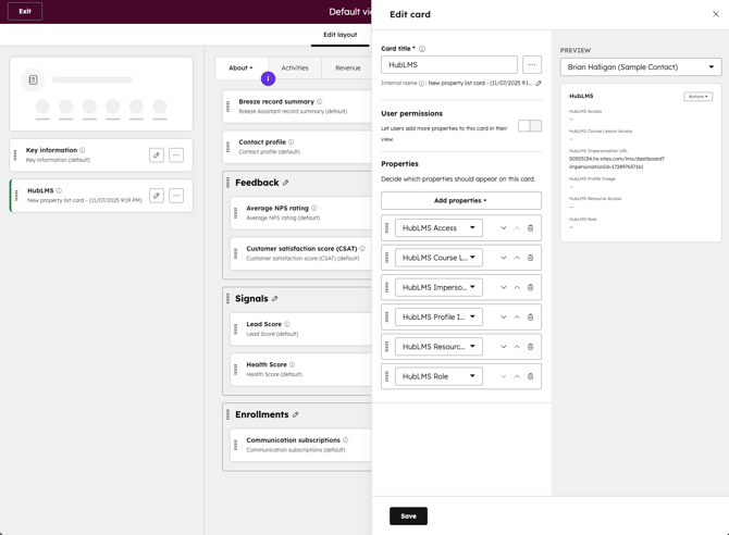 - Create a new HubLMS Card for the left sidebar and add all properties under the HubLMS group.